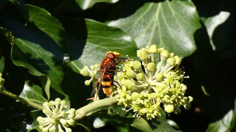 Over the past two years we have been noticing a new visitor to the area – the rather splendid hornet mimic hoverfly (Volucella zonaria). This is the UK’s largest hoverfly at almost 2cm long, and, as its name suggests, it is an excellent mimic of the hornet, but unlike the hornett is harmless to humans. Only a very rare visitor to the country up to the 1940s, it has become more common in Southern England in recent years, and is still spreading northwards, perhaps as a result of climate change. It is particularly prevalent in urban areas. The adults are migratory and the larvae live inside wasps’ nests. WNS member Alan Crawford found this one in his Wrenthorpe garden and previously, they have previously been seen in Ryhill.